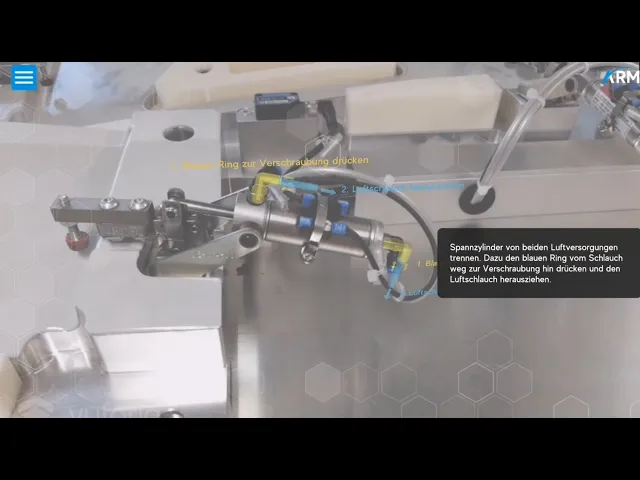 This application tracks a real industrial machine and overlays it with a digital twin, providing digital AR content and step-by-step maintenance instructions.