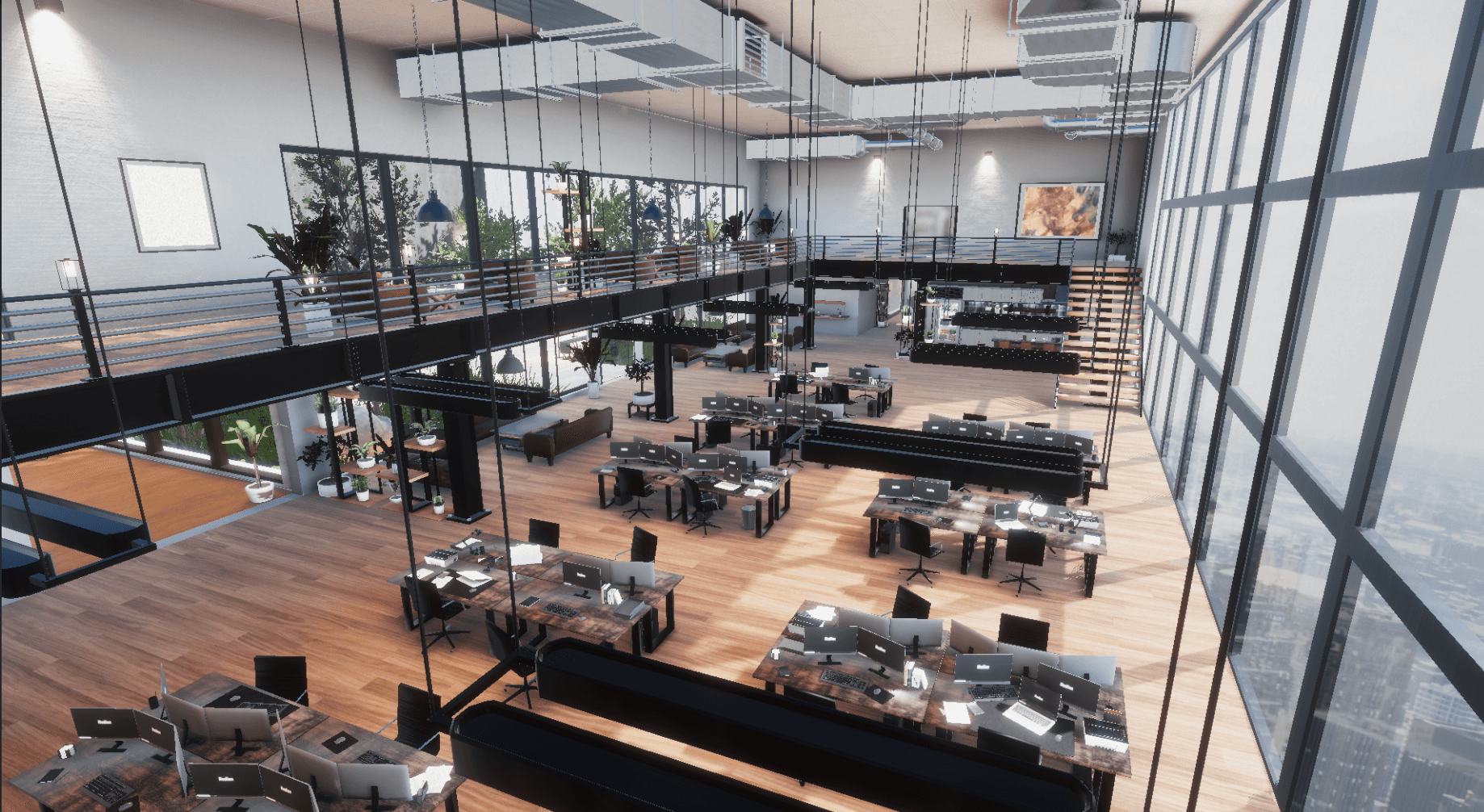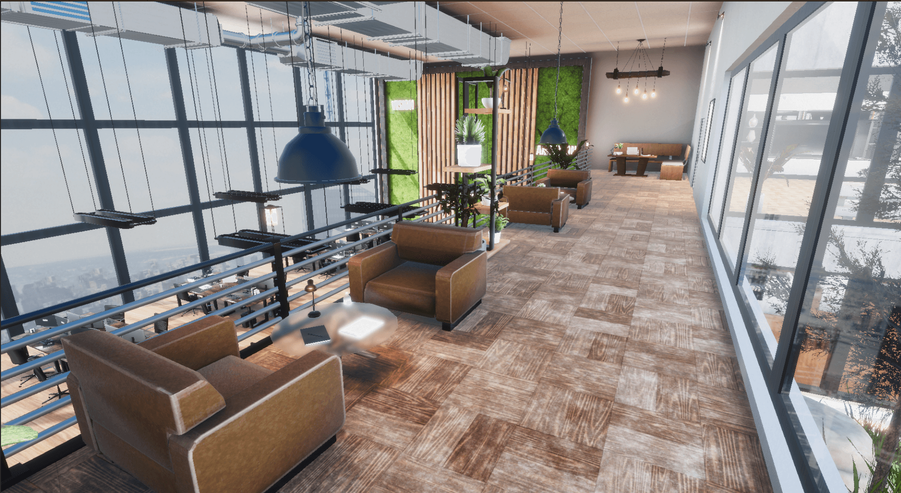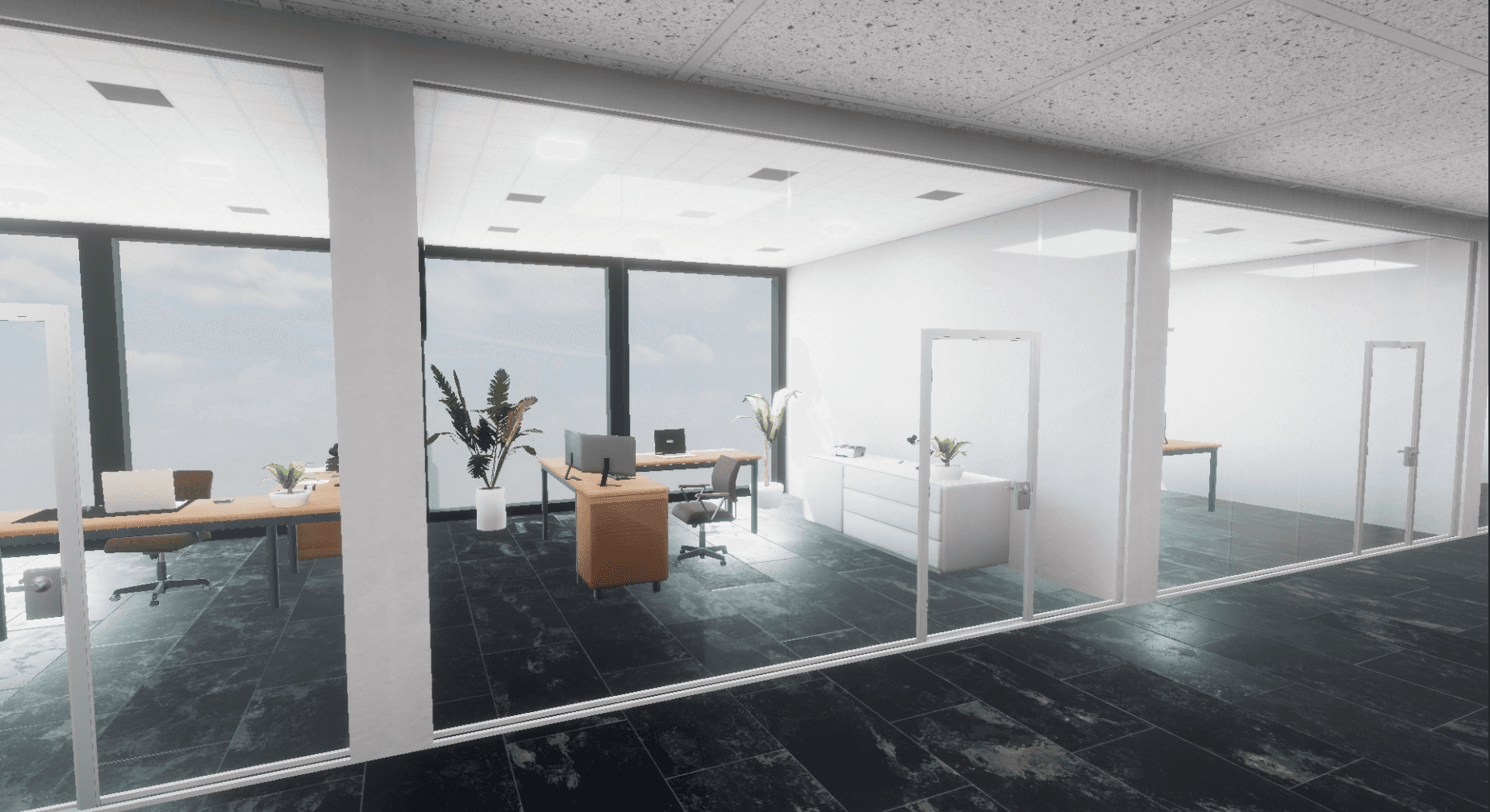 This real-time project serves as a visualization of a fictional large-scale office space, showcasing both design and atmosphere in an interactive way.
