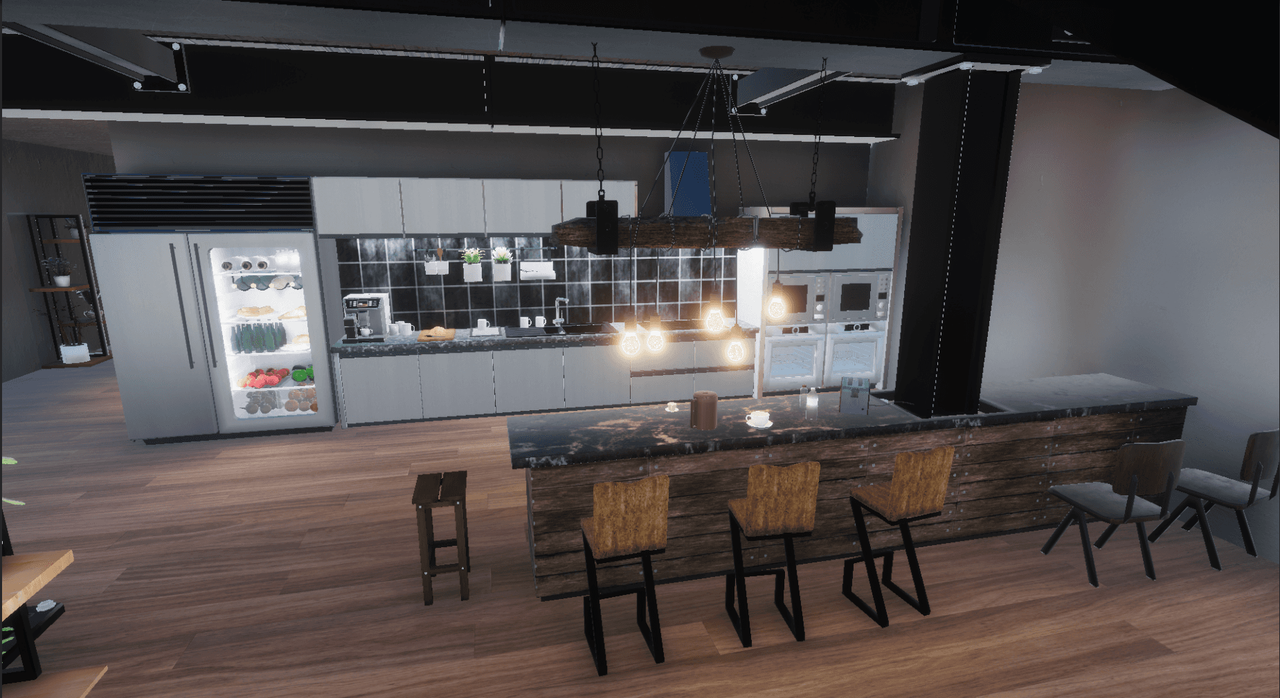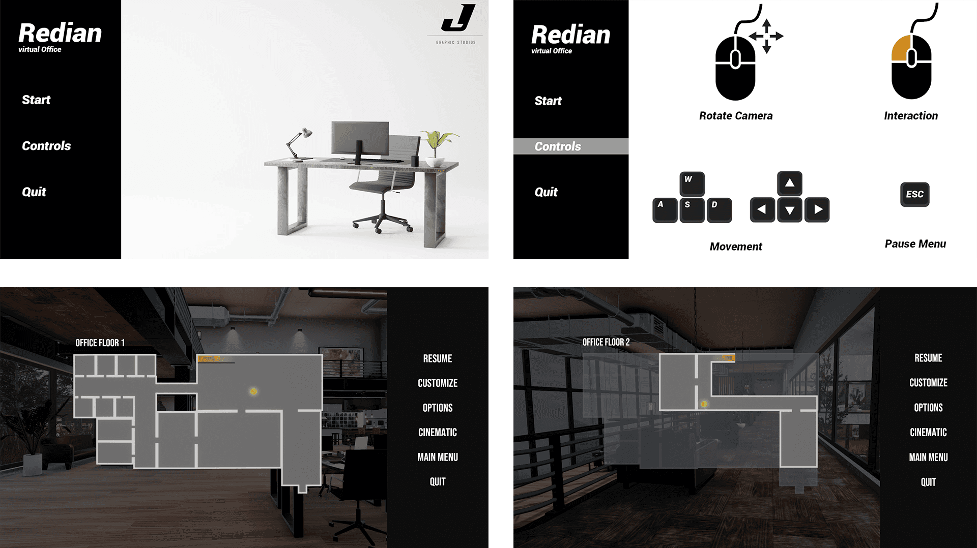 An interactive UI was implemented, featuring graphic and sound settings, a material customizer for room elements, and a pause menu with minimap and additional information.