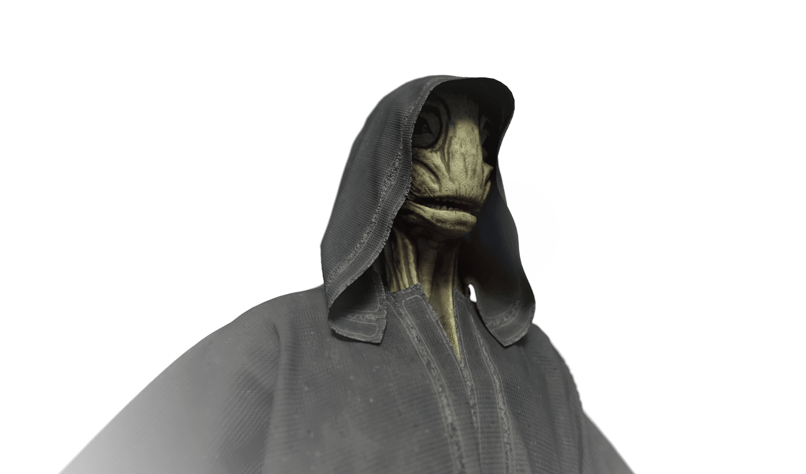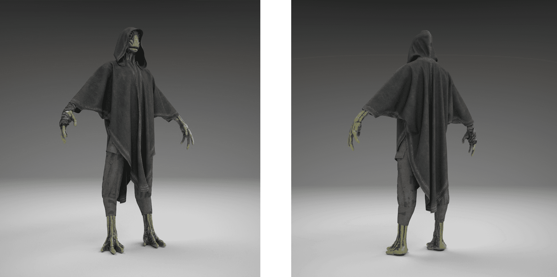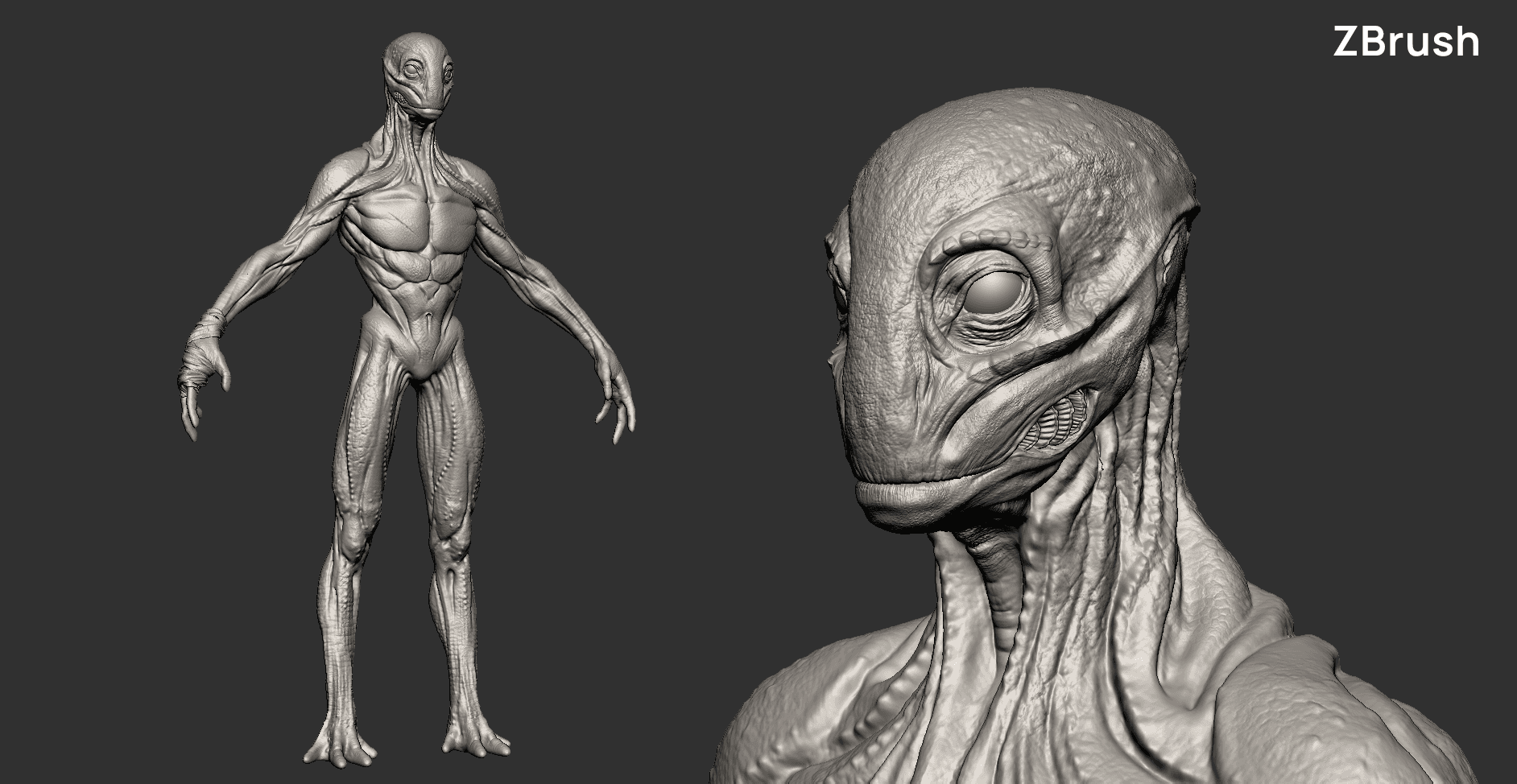 The alien design was concepted in Photoshop, visualized through sculpting in ZBrush, outfitted in Marvelous Designer, prepared in Maya, and textured in Substance Painter.